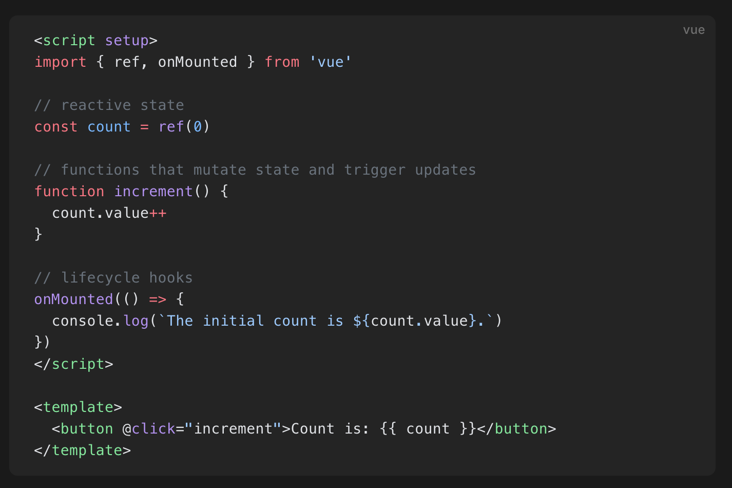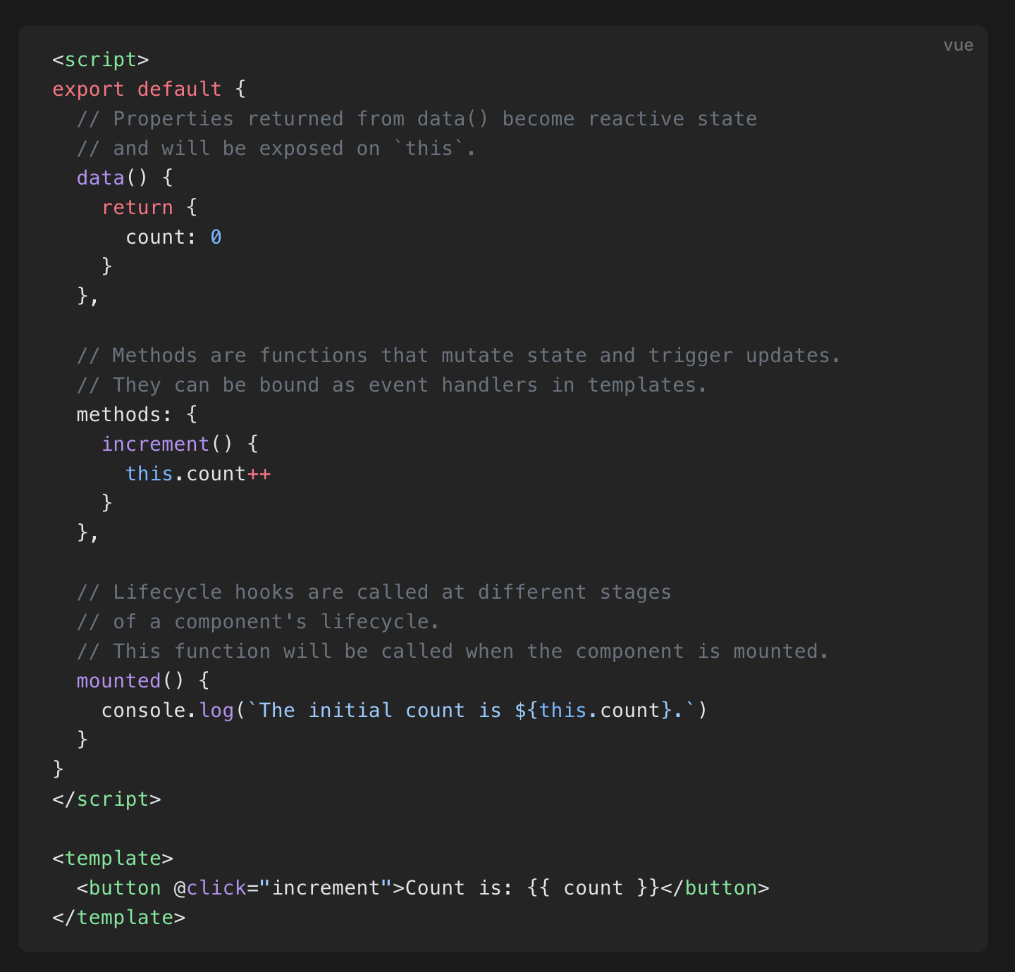 The Options API was introduced with Vue version 2 and is a way of organizing the code/components with methods, computed properties, hooks with an options object. It’s pretty straight forward, clear and an organized structure that makes it easy to read and friendly for developers.