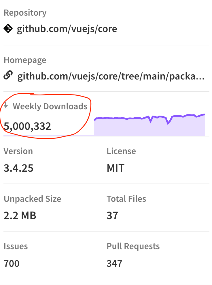 Even looking at the current weekly downloads from npmjs.com, Vue.js has over 5, 000, 000 downloads in the last week from writing this post.