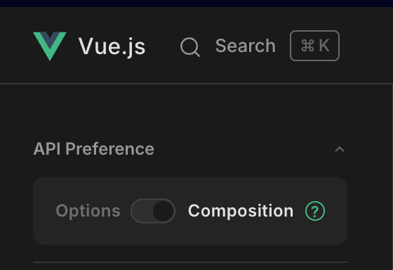 The website also allows for the toggle of all their examples and code to switch between the Options and Composition API’s for reference: