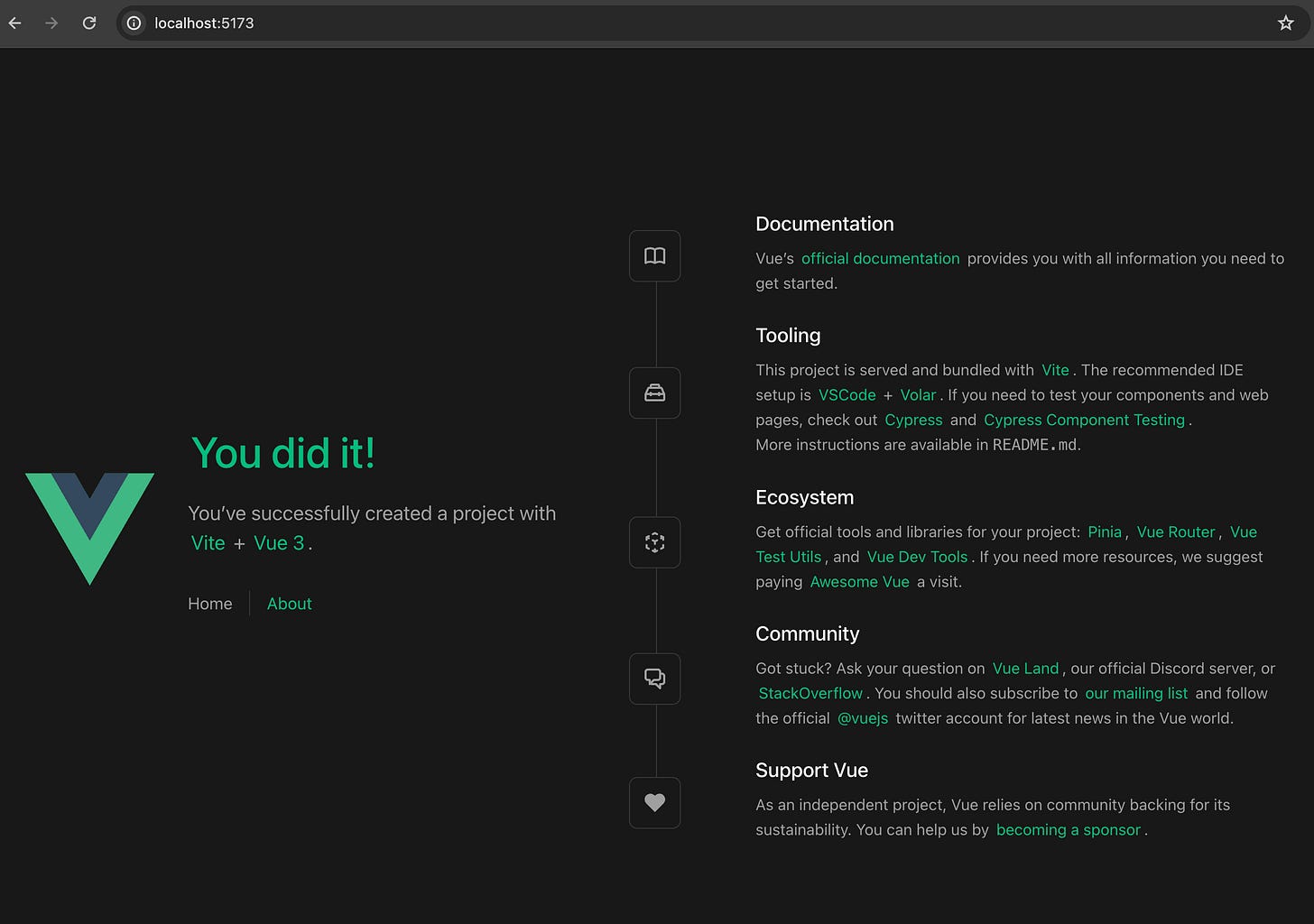 You should now have your first Vue project running! Note that the example components in the generated project are written using the Composition API and