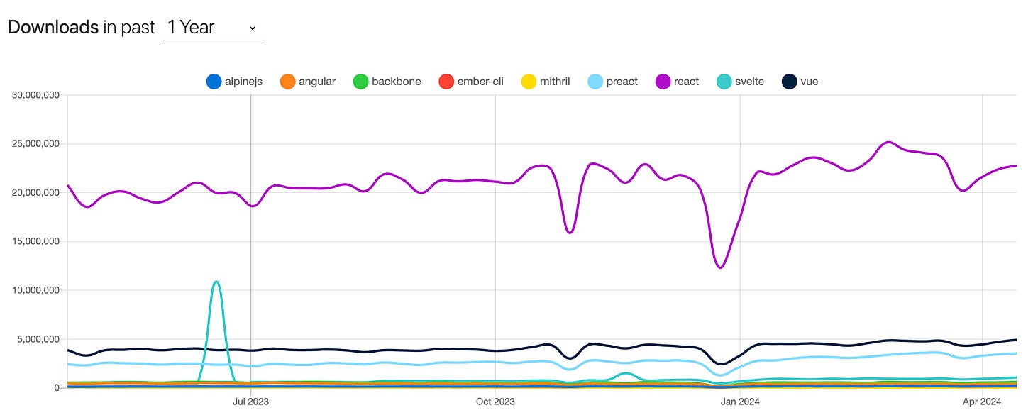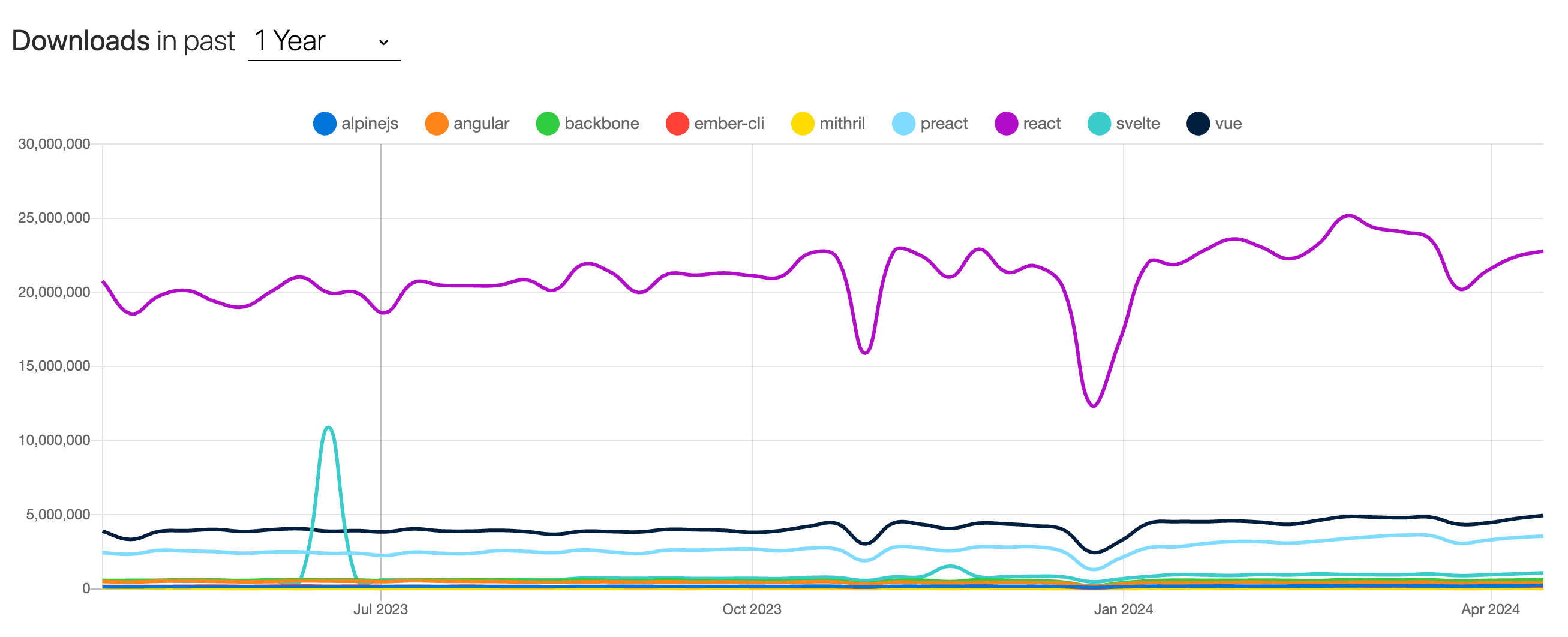 And if we look at the download average over the last year between some of the other popular frameworks, Vue.js is one of the leads (apart from React, which leads partly because it is backed by Meta, providing substantial financial support 😄)